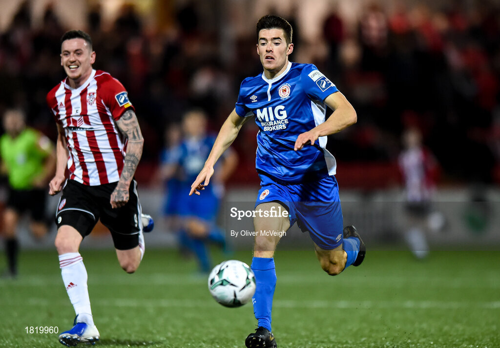 22 October 2019; Lee Desmond of St Patrick's Athletic in action against David Parkhouse of Derry City during the SSE Airtricity League Premier Division match between Derry City and St Patrick's Athletic at Ryan McBride Brandywell Stadium in Derry. Photo by Oliver McVeigh/Sportsfile