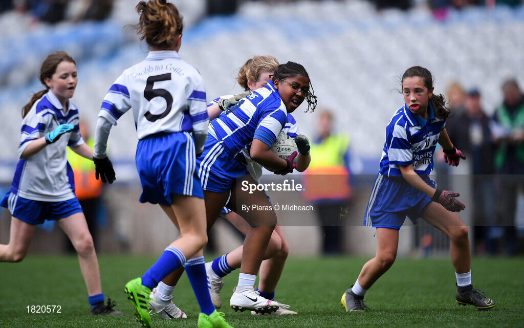 23 October 2019; Maria Kamara of Bishop Galvin NS, Templeogue, in action against Gaelscoil Thaobh na Coille, An Chéim, in the Corn Austin Finn Shield Final during day two of the Allianz Cumann na mBunscol Finals at Croke Park in Dublin. Photo by Piaras Ó Mídheach/Sportsfile