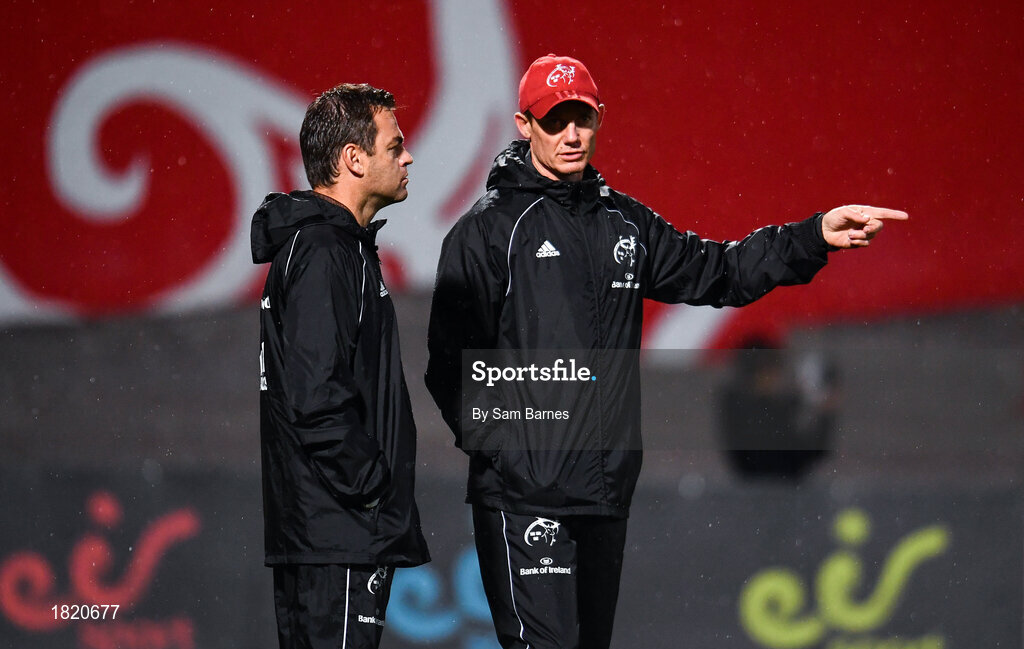 25 October 2019; Munster head coach Johann van Graan, left, in conversation with Senior Coach Stephen Larkham ahead of the Guinness PRO14 Round 4 match between Munster and Ospreys at Irish Independent Park in Cork. Photo by Sam Barnes/Sportsfile