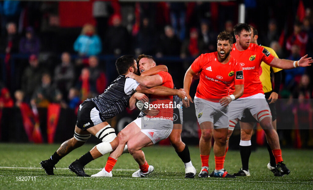 25 October 2019; Rory Scannell of Munster is tackled by Gareth Evans, left, and Tom Botha of Ospreys, hidden, during the Guinness PRO14 Round 4 match between Munster and Ospreys at Irish Independent Park in Cork. Photo by Sam Barnes/Sportsfile