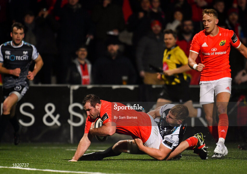 25 October 2019; James Cronin of Munster goes over to score his side's first try despite the tackle by Olly Cracknell of Ospreys during the Guinness PRO14 Round 4 match between Munster and Ospreys at Irish Independent Park in Cork. Photo by Sam Barnes/Sportsfile