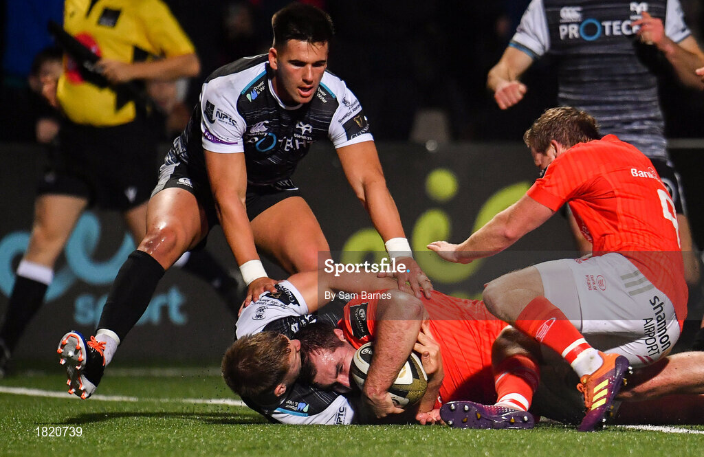 25 October 2019; James Cronin of Munster goes over to score his side's first try despite the tackle by Olly Cracknell of Ospreys during the Guinness PRO14 Round 4 match between Munster and Ospreys at Irish Independent Park in Cork. Photo by Sam Barnes/Sportsfile