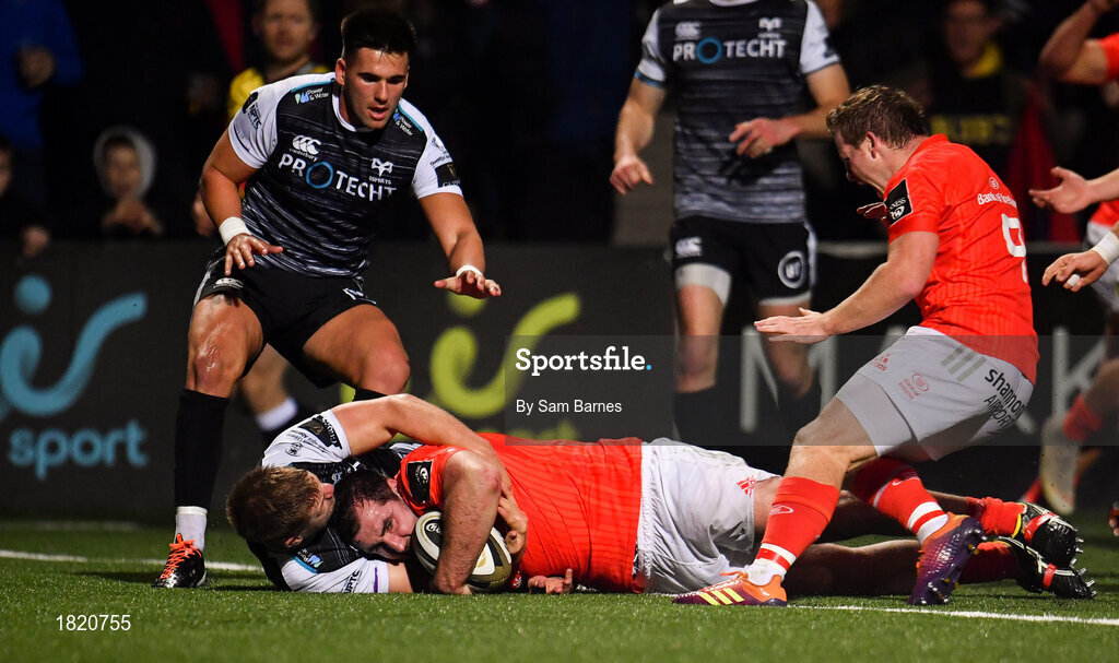 25 October 2019; James Cronin of Munster goes over to score his side's first try despite the tackle by Olly Cracknell of Ospreys during the Guinness PRO14 Round 4 match between Munster and Ospreys at Irish Independent Park in Cork. Photo by Sam Barnes/Sportsfile