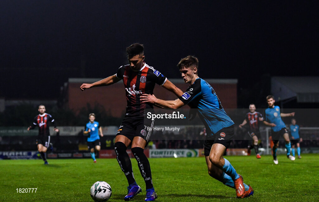 25 October 2019; Danny Mandroiu of Bohemians in action against Niall Morahan of Sligo Rovers during the SSE Airtricity League Premier Division match between Bohemians and Sligo Rovers at Dalymount Park in Dublin. Photo by Harry Murphy/Sportsfile