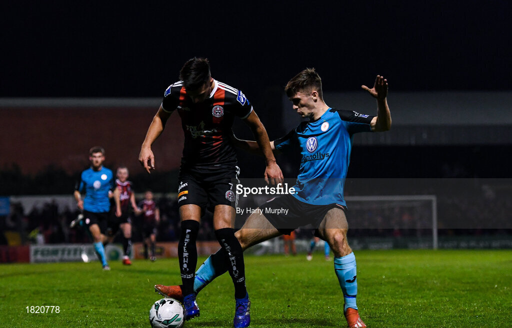 25 October 2019; Danny Mandroiu of Bohemians in action against Niall Morahan of Sligo Rovers during the SSE Airtricity League Premier Division match between Bohemians and Sligo Rovers at Dalymount Park in Dublin. Photo by Harry Murphy/Sportsfile