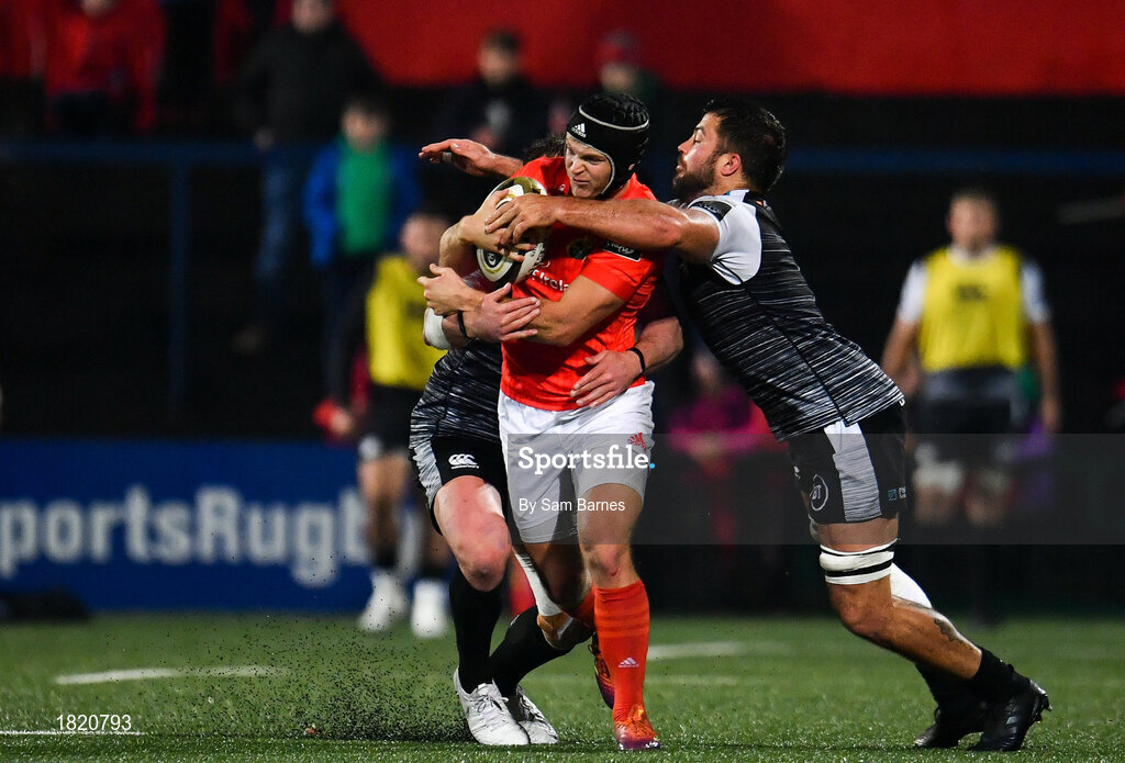 25 October 2019; Tyler Bleyendaal of Munster is tackled by Gareth Evans, right, and Tom Botha of Ospreys during the Guinness PRO14 Round 4 match between Munster and Ospreys at Irish Independent Park in Cork. Photo by Sam Barnes/Sportsfile