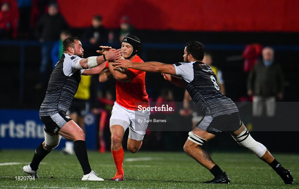 25 October 2019; Tyler Bleyendaal of Munster is tackled by Gareth Evans, right, and Tom Botha of Ospreys during the Guinness PRO14 Round 4 match between Munster and Ospreys at Irish Independent Park in Cork. Photo by Sam Barnes/Sportsfile
