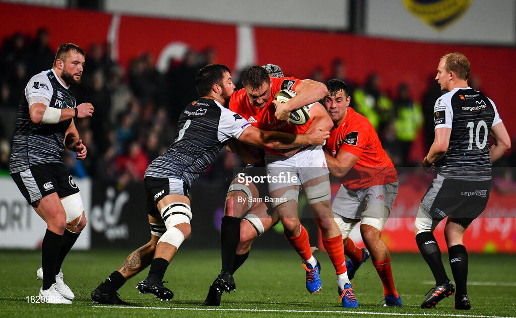 25 October 2019; Tommy O'Donnell of Munster is tackled by Gareth Evans, left and Dan Lydiate, hidden, both of Ospreys during the Guinness PRO14 Round 4 match between Munster and Ospreys at Irish Independent Park in Cork. Photo by Sam Barnes/Sportsfile