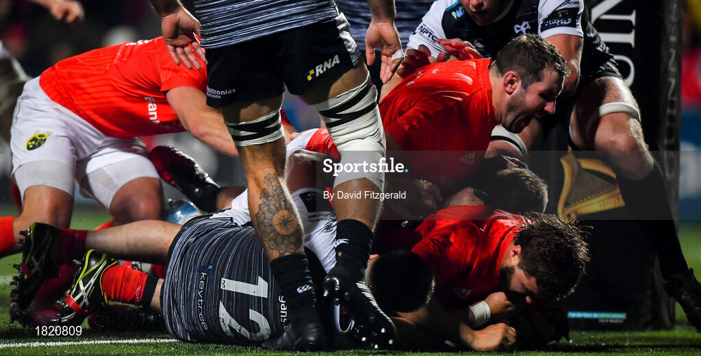 25 October 2019; Rhys Marhsall of Munster goes over to score his side's second try during the Guinness PRO14 Round 4 match between Munster and Ospreys at Irish Independent Park in Cork. Photo by David Fitzgerald/Sportsfile