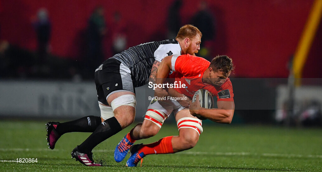 25 October 2019; Arno Botha of Munster is tackled by Dan Baker of Ospreys during the Guinness PRO14 Round 4 match between Munster and Ospreys at Irish Independent Park in Cork. Photo by David Fitzgerald/Sportsfile