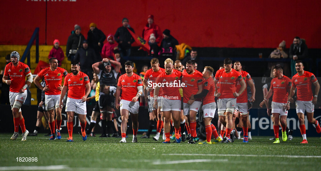 25 October 2019; Munster players celebrate after their fourth try during the Guinness PRO14 Round 4 match between Munster and Ospreys at Irish Independent Park in Cork. Photo by Sam Barnes/Sportsfile