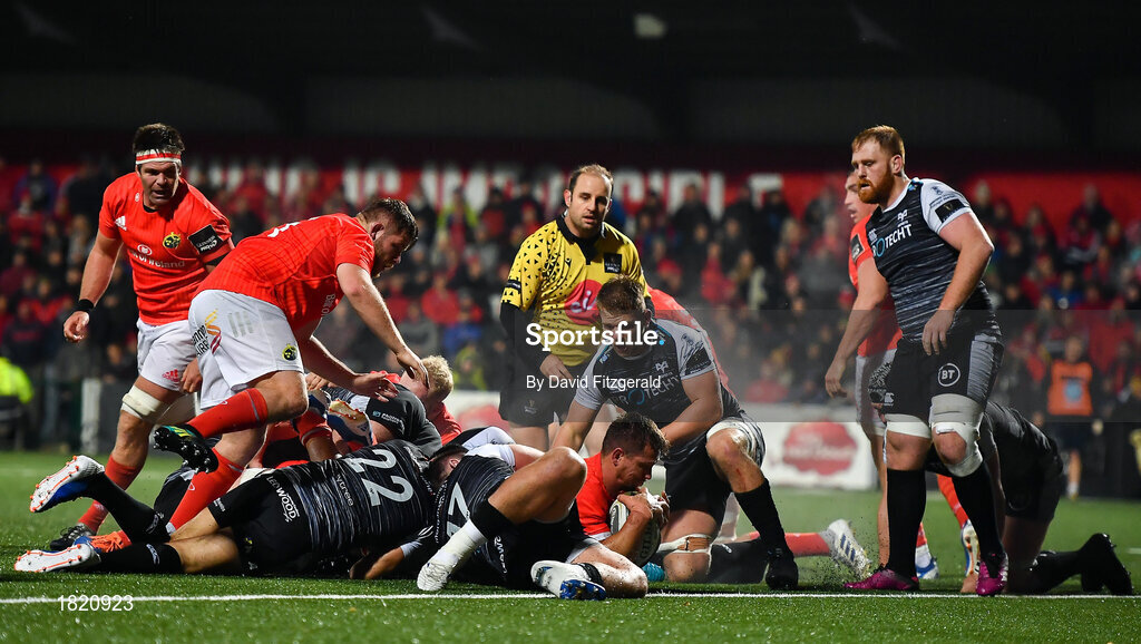 25 October 2019; Arno Botha of Munster goes over to score his side's fourth try during the Guinness PRO14 Round 4 match between Munster and Ospreys at Irish Independent Park in Cork. Photo by David Fitzgerald/Sportsfile