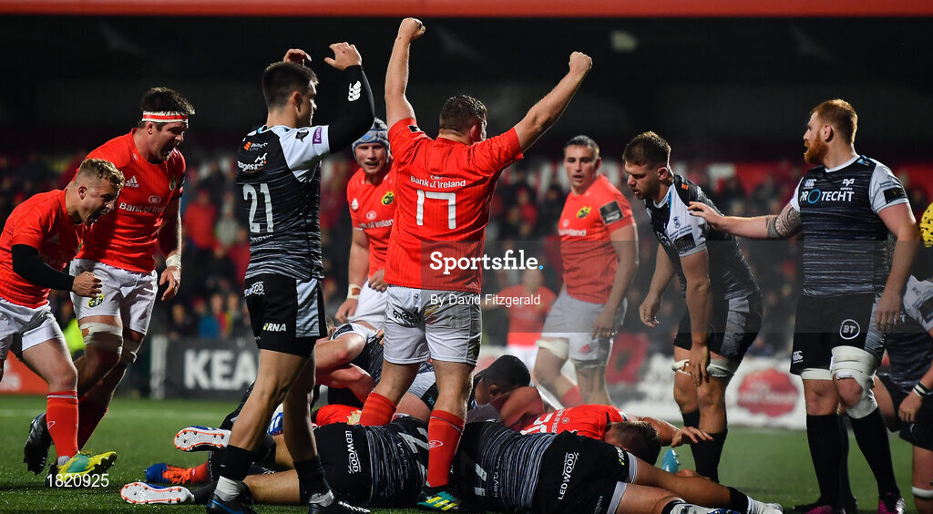 25 October 2019; Arno Botha of Munster goes over to score his side's fourth try during the Guinness PRO14 Round 4 match between Munster and Ospreys at Irish Independent Park in Cork. Photo by David Fitzgerald/Sportsfile
