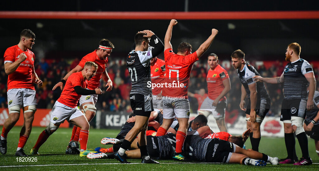 25 October 2019; Arno Botha of Munster goes over to score his side's fourth try during the Guinness PRO14 Round 4 match between Munster and Ospreys at Irish Independent Park in Cork. Photo by David Fitzgerald/Sportsfile