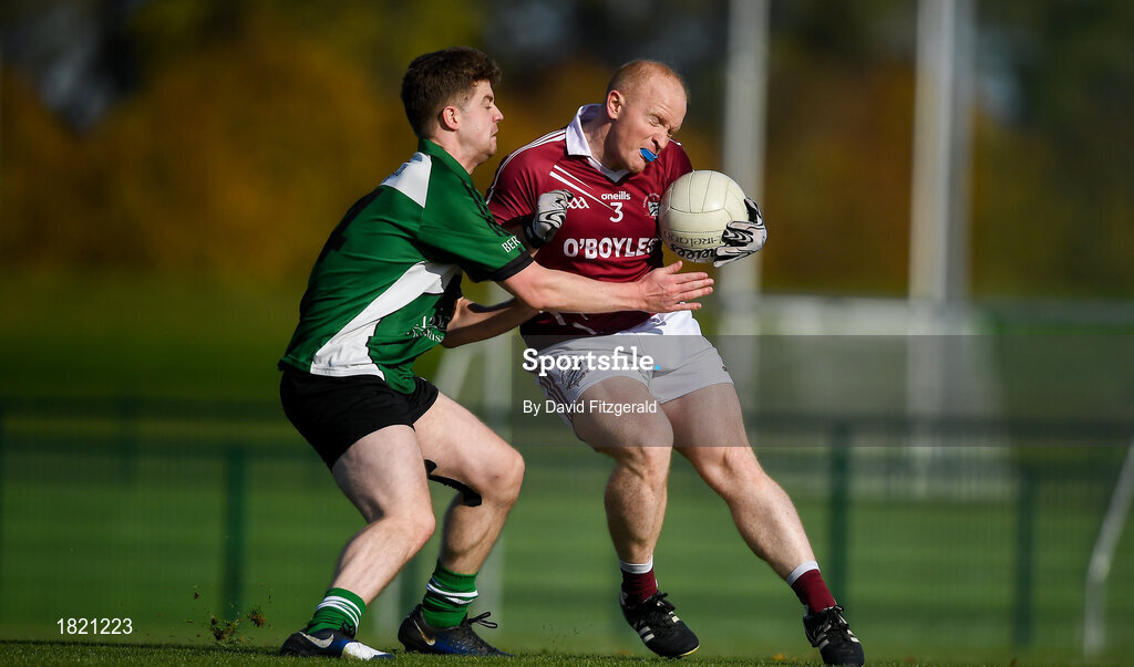 26 October 2019; John Gill of Kennagh GAA in action against John Rogers of Berlin GAA during the AIB Leinster Club Junior Football Championship Round 1 match between Berlin GAA and Kenagh GAA at GAA Centre of Excellence at Abbottstown, Dublin. Photo by David Fitzgerald/Sportsfile