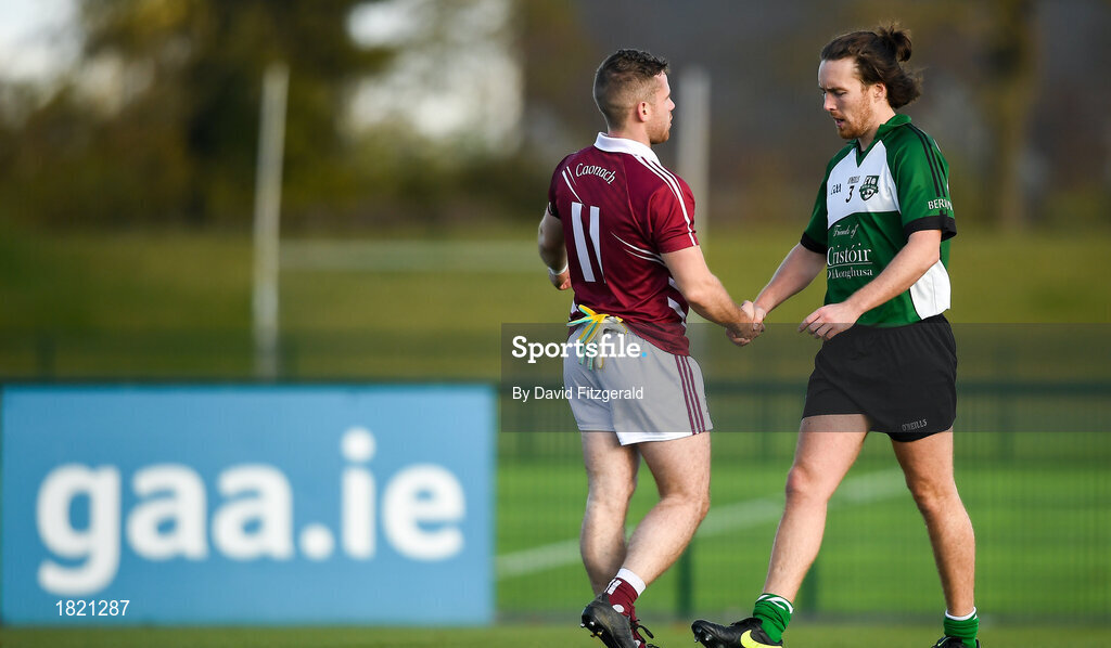 26 October 2019; Conor Nolan of Berlin GAA shakes hands with David Jones of Kenagh GAA following the AIB Leinster Club Junior Football Championship Round 1 match between Berlin GAA and Kenagh GAA at GAA Centre of Excellence at Abbottstown, Dublin. Photo by David Fitzgerald/Sportsfile