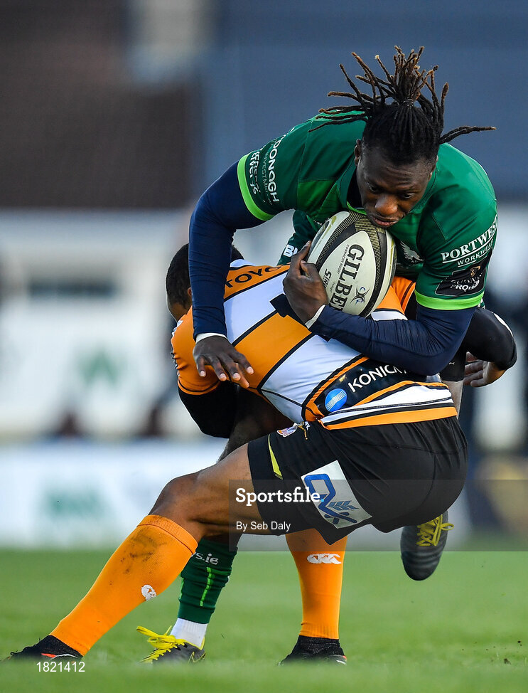 26 October 2019; Niyi Adeolokun of Connacht is tackled by Rhyno Smith of Toyota Cheetahs during the Guinness PRO14 Round 4 match between Connacht and Toyota Cheetahs at The Sportsground in Galway. Photo by Seb Daly/Sportsfile