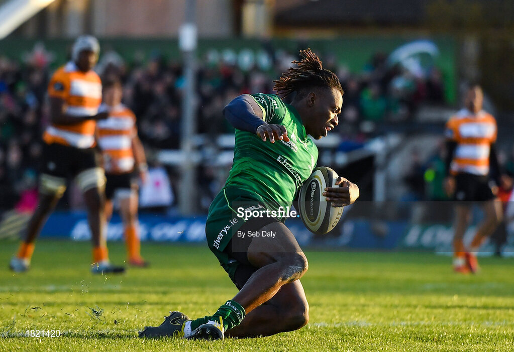 26 October 2019; Niyi Adeolokun of Connacht dives over to score his side's first try during the Guinness PRO14 Round 4 match between Connacht and Toyota Cheetahs at The Sportsground in Galway. Photo by Seb Daly/Sportsfile