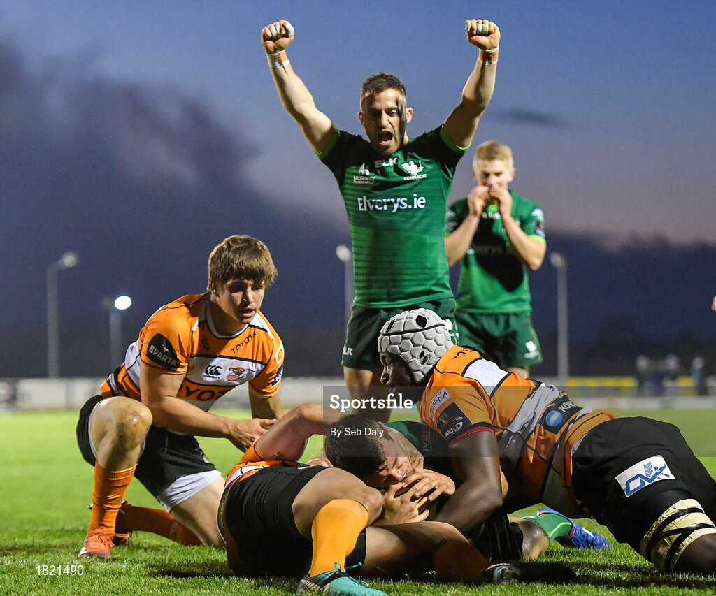 26 October 2019; Tom Farrell of Connacht dives over to score his side's third try during the Guinness PRO14 Round 4 match between Connacht and Toyota Cheetahs at The Sportsground in Galway. Photo by Seb Daly/Sportsfile