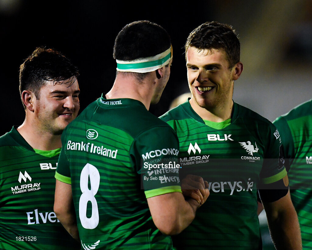 26 October 2019; Tom Farrell of Connacht, right, is congratulated by team-mate Paul Boyle, centre, following his last minute try during the Guinness PRO14 Round 4 match between Connacht and Toyota Cheetahs at The Sportsground in Galway. Photo by Seb Daly/Sportsfile