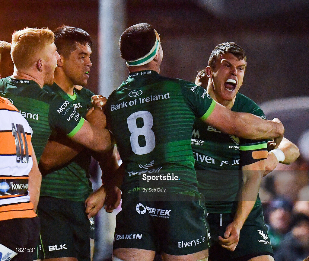 26 October 2019; Tom Farrell of Connacht, right, celebrates with team-mates after scoring his side's fourth try during the Guinness PRO14 Round 4 match between Connacht and Toyota Cheetahs at The Sportsground in Galway. Photo by Seb Daly/Sportsfile