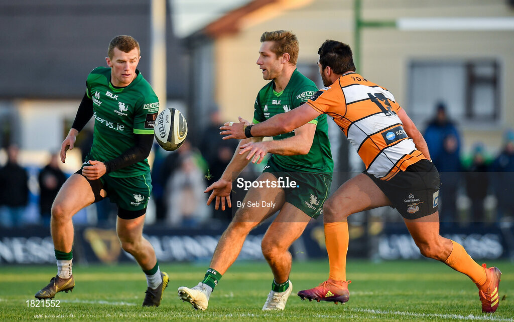 26 October 2019; Kyle Godwin of Connacht passes to team-mate Stephen Fitzgerald under pressure from Dries Swanepoel of Toyota Cheetahs during the Guinness PRO14 Round 4 match between Connacht and Toyota Cheetahs at The Sportsground in Galway. Photo by Seb Daly/Sportsfile