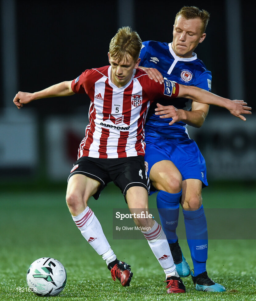 22 October 2019; Ciaron Harkin of Derry City in action against Jamie Lennon of St Patrick's Athletic during the SSE Airtricity League Premier Division match between Derry City and St Patrick's Athletic at Ryan McBride Brandywell Stadium in Derry. Photo by Oliver McVeigh/Sportsfile