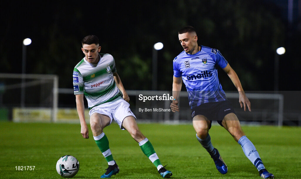 18 October 2019; Gary O'Neill of Shamrock Rovers and Richie O'Farrell of UCD during the SSE Airtricity League Premier Division match between UCD and Shamrock Rovers at The UCD Bowl in Belfield, Dublin. Photo by Ben McShane/Sportsfile