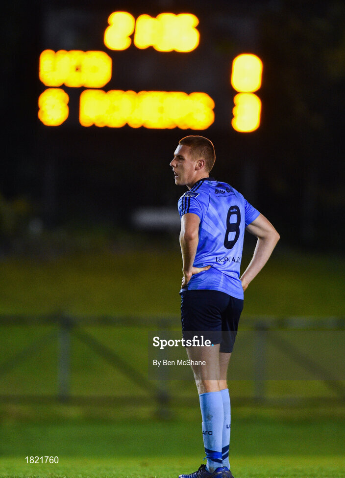 18 October 2019; Jack Keaney of UCD reacts at the final whistle of the SSE Airtricity League Premier Division match between UCD and Shamrock Rovers at The UCD Bowl in Belfield, Dublin. Photo by Ben McShane/Sportsfile