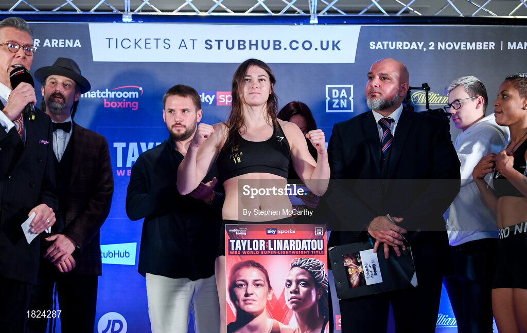 1 November 2019; Katie Taylor weighs in at the Radisson Blu Edwardian Hotel in Manchester, England, ahead of her WBO Women's Super-Lightweight World title fight against Christina Linardatou on Saturday night at the Manchester Arena. Photo by Stephen McCarthy/Sportsfile