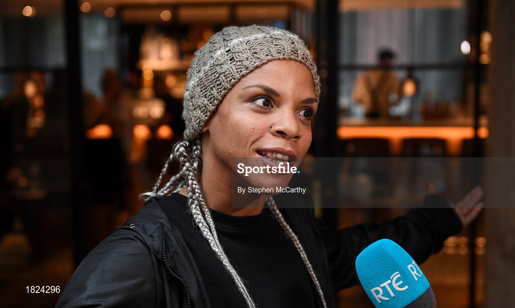 1 November 2019; Christina Linardatou speaks with RTÉ after weigh in's at the Radisson Blu Edwardian Hotel in Manchester, England, ahead of her WBO Women's Super-Lightweight World title fight against Katie Taylor on Saturday night at the Manchester Arena. Photo by Stephen McCarthy/Sportsfile
