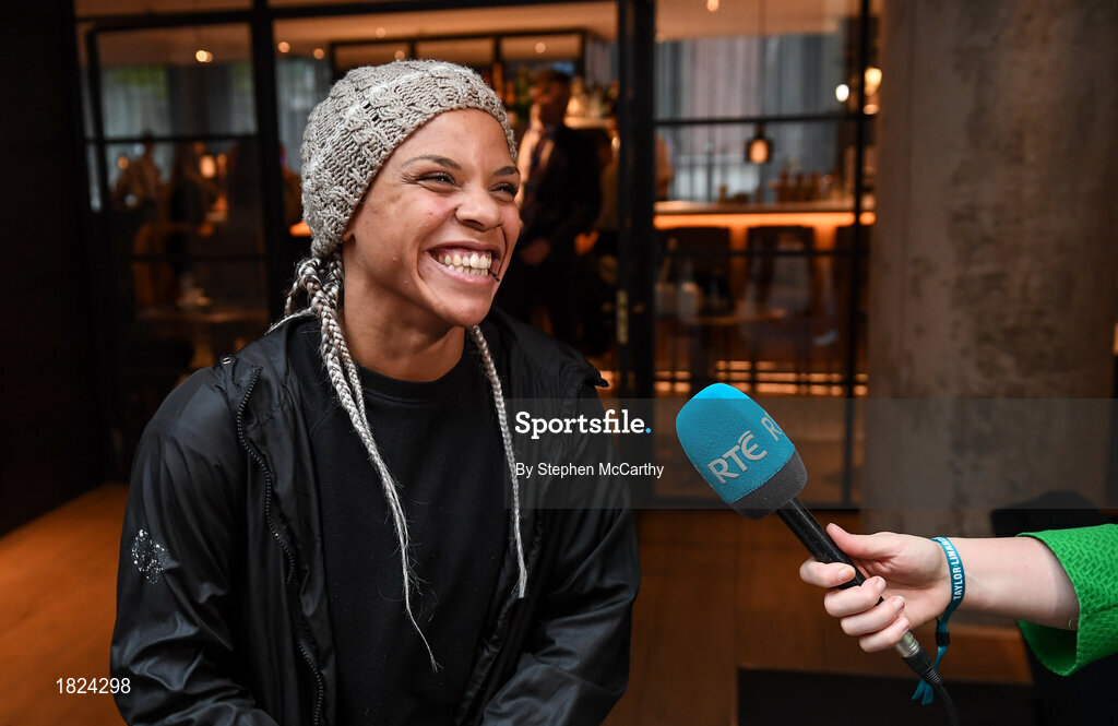 1 November 2019; Christina Linardatou speaks with RTÉ after weigh in's at the Radisson Blu Edwardian Hotel in Manchester, England, ahead of her WBO Women's Super-Lightweight World title fight against Katie Taylor on Saturday night at the Manchester Arena. Photo by Stephen McCarthy/Sportsfile