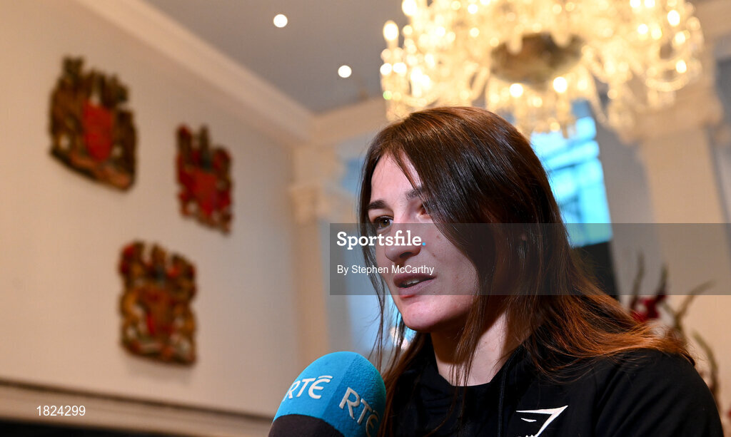 1 November 2019; Katie Taylor after weighing in at the Radisson Blu Edwardian Hotel in Manchester, England, ahead of her WBO Women's Super-Lightweight World title fight against Christina Linardatou on Saturday night at the Manchester Arena. Photo by Stephen McCarthy/Sportsfile