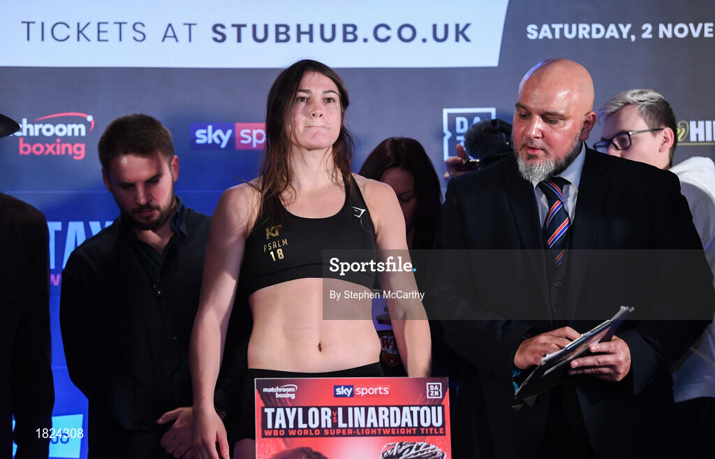 1 November 2019; Katie Taylor weighs-in at the Radisson Blu Edwardian Hotel in Manchester, England, ahead of her WBO Women's Super-Lightweight World title fight against Christina Linardatou on Saturday night at the Manchester Arena. Photo by Stephen McCarthy/Sportsfile