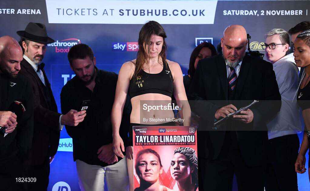 1 November 2019; Katie Taylor weighs-in at the Radisson Blu Edwardian Hotel in Manchester, England, ahead of her WBO Women's Super-Lightweight World title fight against Christina Linardatou on Saturday night at the Manchester Arena. Photo by Stephen McCarthy/Sportsfile