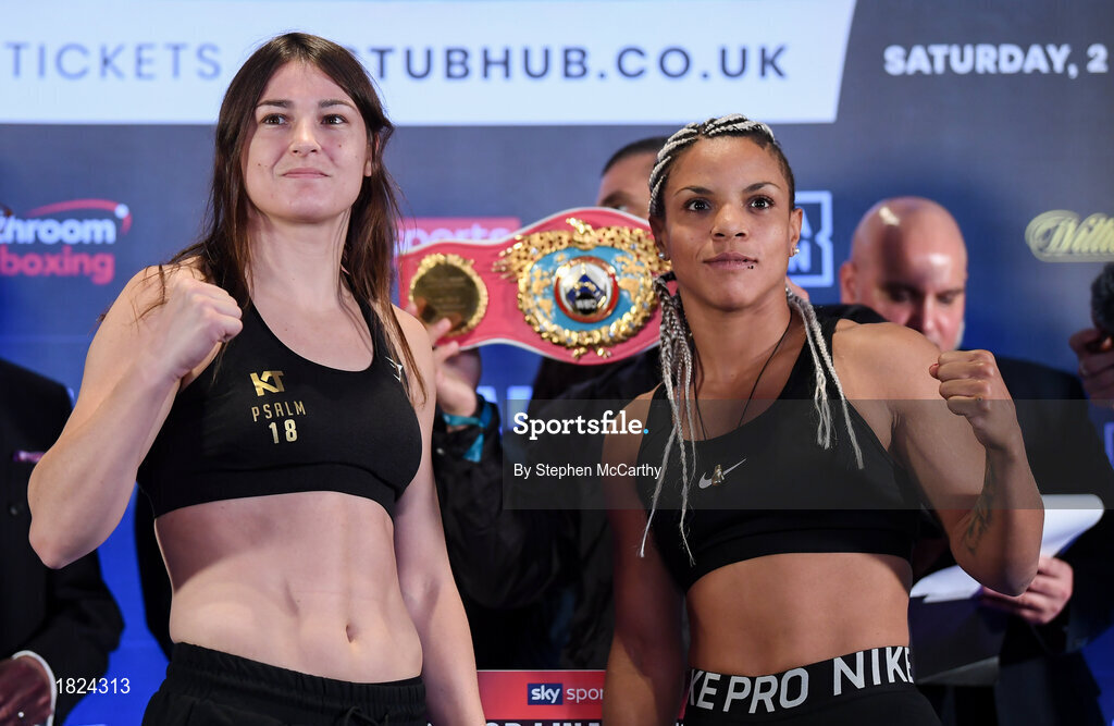 1 November 2019; Katie Taylor and Christina Linardatou after weighing in at the Radisson Blu Edwardian Hotel in Manchester, England, ahead of their WBO Women's Super-Lightweight World title fight on Saturday night at the Manchester Arena. Photo by Stephen McCarthy/Sportsfile