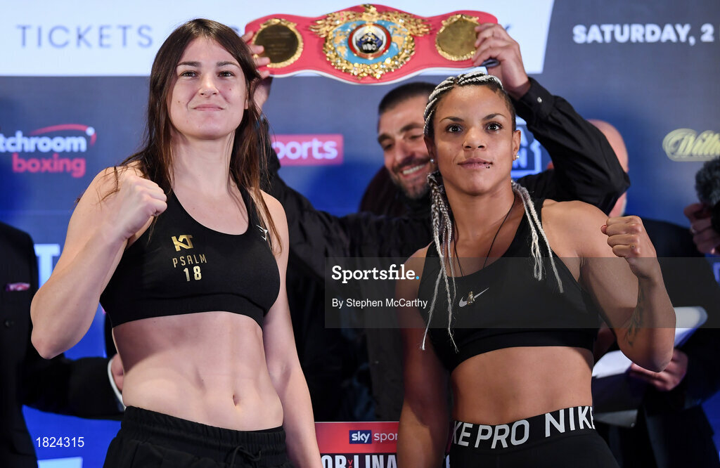 1 November 2019; Katie Taylor and Christina Linardatou after weighing in at the Radisson Blu Edwardian Hotel in Manchester, England, ahead of their WBO Women's Super-Lightweight World title fight on Saturday night at the Manchester Arena. Photo by Stephen McCarthy/Sportsfile