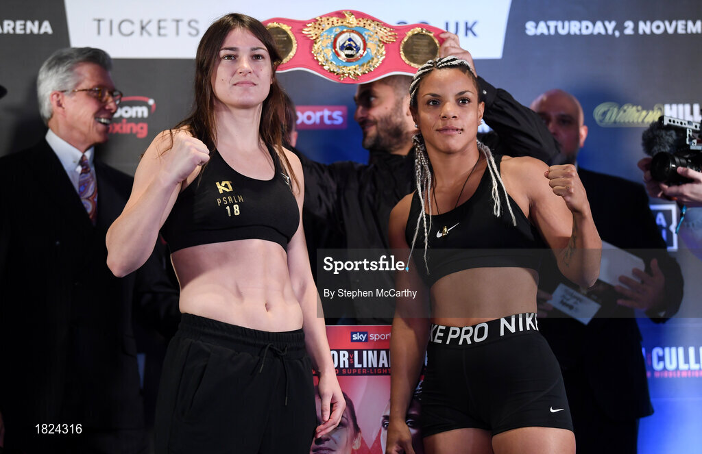 1 November 2019; Katie Taylor and Christina Linardatou after weighing in at the Radisson Blu Edwardian Hotel in Manchester, England, ahead of their WBO Women's Super-Lightweight World title fight on Saturday night at the Manchester Arena. Photo by Stephen McCarthy/Sportsfile