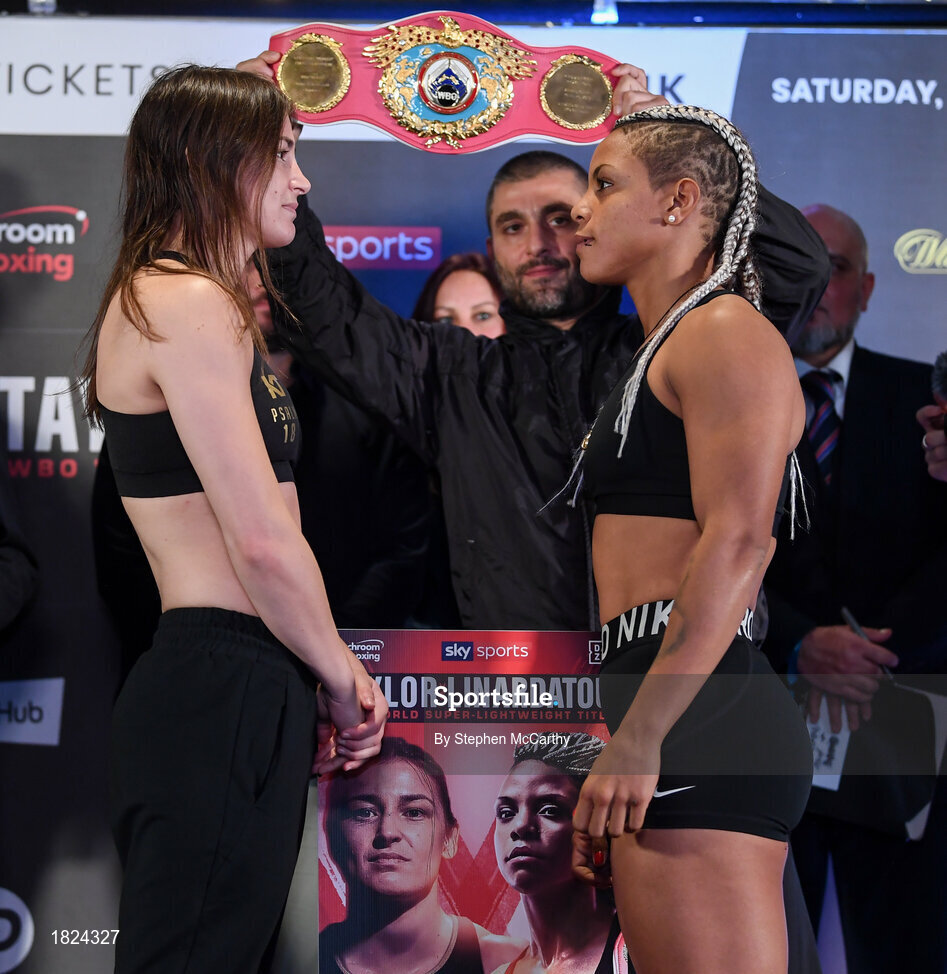 1 November 2019; Katie Taylor and Christina Linardatou after weighing in at the Radisson Blu Edwardian Hotel in Manchester, England, ahead of their WBO Women's Super-Lightweight World title fight on Saturday night at the Manchester Arena. Photo by Stephen McCarthy/Sportsfile