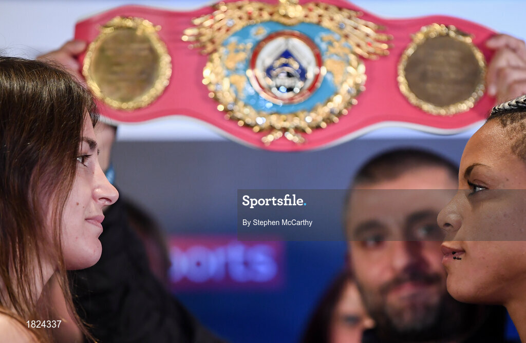 1 November 2019; Katie Taylor and Christina Linardatou after weighing in at the Radisson Blu Edwardian Hotel in Manchester, England, ahead of their WBO Women's Super-Lightweight World title fight on Saturday night at the Manchester Arena. Photo by Stephen McCarthy/Sportsfile