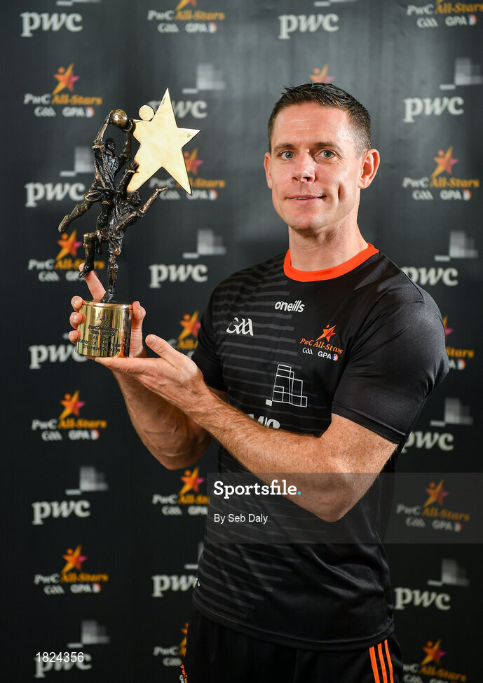 1 November 2019; PwC GAA GPA Footballer of the Year Stephen Cluxton of Dublin with his award at the PwC All-Stars 2019 at the Convention Centre in Dublin. Photo by Seb Daly/Sportsfile