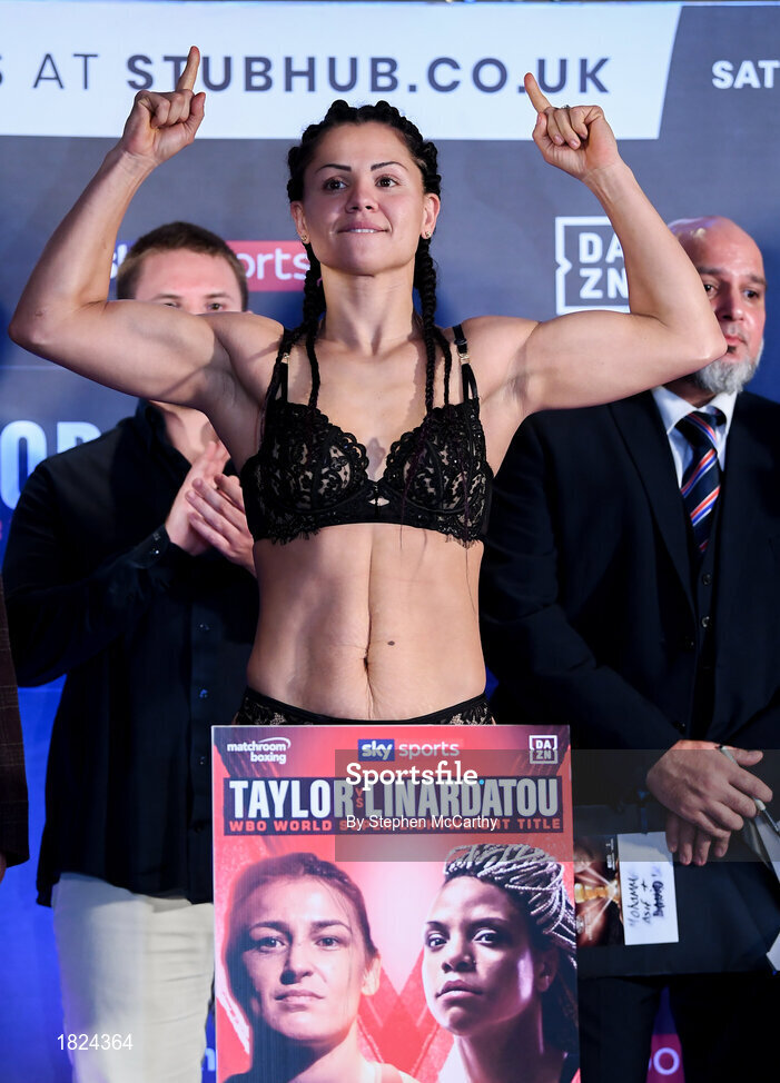 1 November 2019; Viviane Obenauf weighs-in at the Radisson Blu Edwardian Hotel in Manchester, England, ahead of her IBO Women's Super Featherweight World title fight against Terri Harper on Saturday night at the Manchester Arena. Photo by Stephen McCarthy/Sportsfile