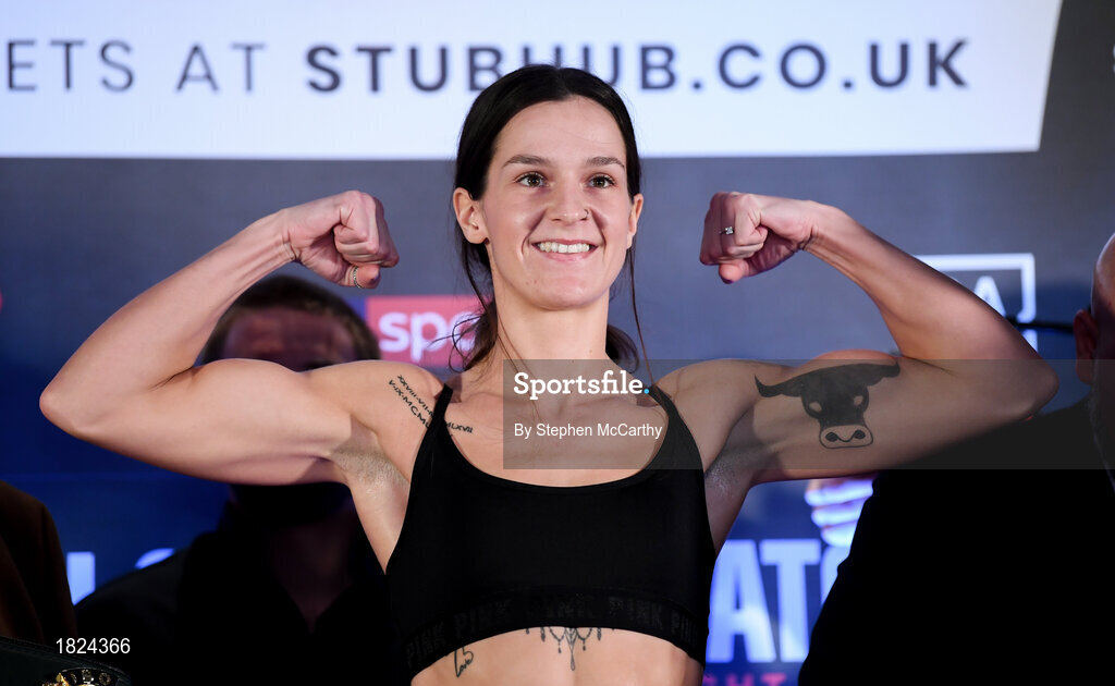 1 November 2019; Terri Harper weighs-in at the Radisson Blu Edwardian Hotel in Manchester, England, ahead of her IBO Women's Super Featherweight World title fight against Viviane Obenauf on Saturday night at the Manchester Arena. Photo by Stephen McCarthy/Sportsfile