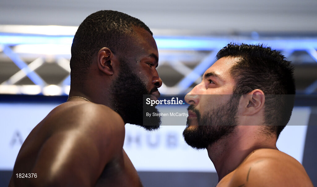 1 November 2019; Martin Bakole Ilunga, left, and Rodney Hernandez after weighing-in at the Radisson Blu Edwardian Hotel in Manchester, England, ahead of their heavyweight fight on Saturday night at the Manchester Arena. Photo by Stephen McCarthy/Sportsfile