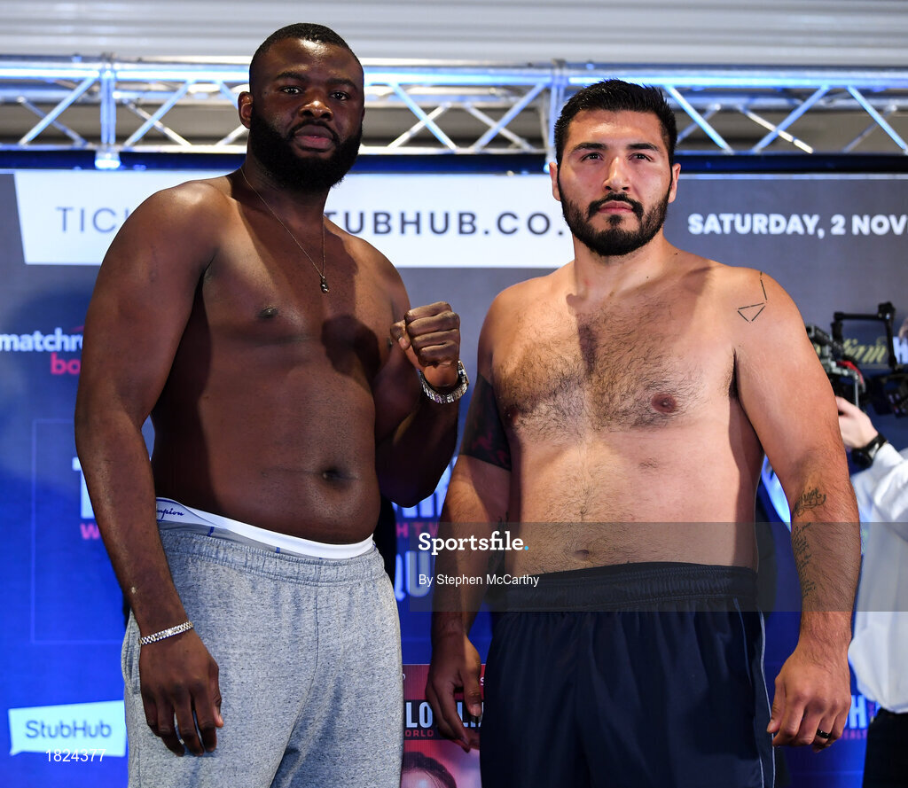 1 November 2019; Martin Bakole Ilunga, left, and Rodney Hernandez after weighing-in at the Radisson Blu Edwardian Hotel in Manchester, England, ahead of their heavyweight fight on Saturday night at the Manchester Arena. Photo by Stephen McCarthy/Sportsfile