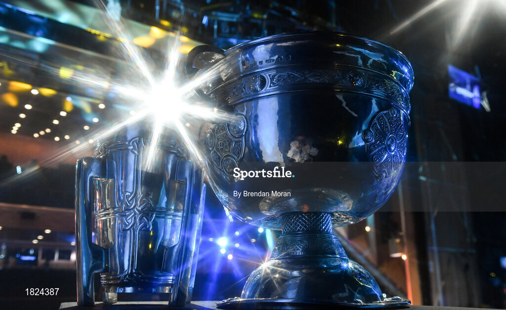 1 November 2019; (EDITOR'S NOTE: This image was created using a starburst filter) The Liam MacCarthy and Sam Maguire cups stand in the main auditorium prior to the PwC All-Stars 2019 at the Convention Centre in Dublin. Photo by Brendan Moran/Sportsfile