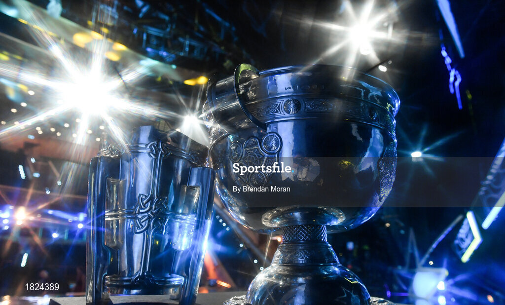 1 November 2019; (EDITOR'S NOTE: This image was created using a starburst filter) The Liam MacCarthy and Sam Maguire cups stand in the main auditorium prior to the PwC All-Stars 2019 at the Convention Centre in Dublin. Photo by Brendan Moran/Sportsfile