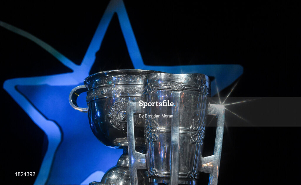 1 November 2019; (EDITOR'S NOTE: This image was created using a starburst filter) The Sam Maguire and Liam MacCarthy cups stand in the main auditorium prior to the PwC All-Stars 2019 at the Convention Centre in Dublin. Photo by Brendan Moran/Sportsfile
