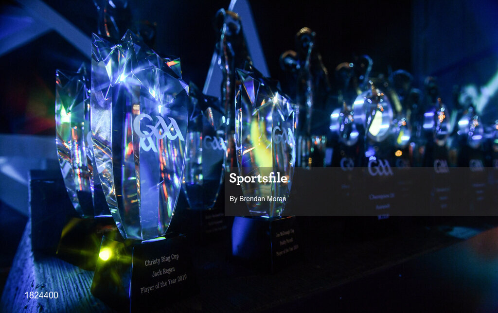 1 November 2019; (EDITOR'S NOTE: This image was created using a starburst filter) Awards are seen in the main auditorium prior to the PwC All-Stars 2019 at the Convention Centre in Dublin. Photo by Brendan Moran/Sportsfile