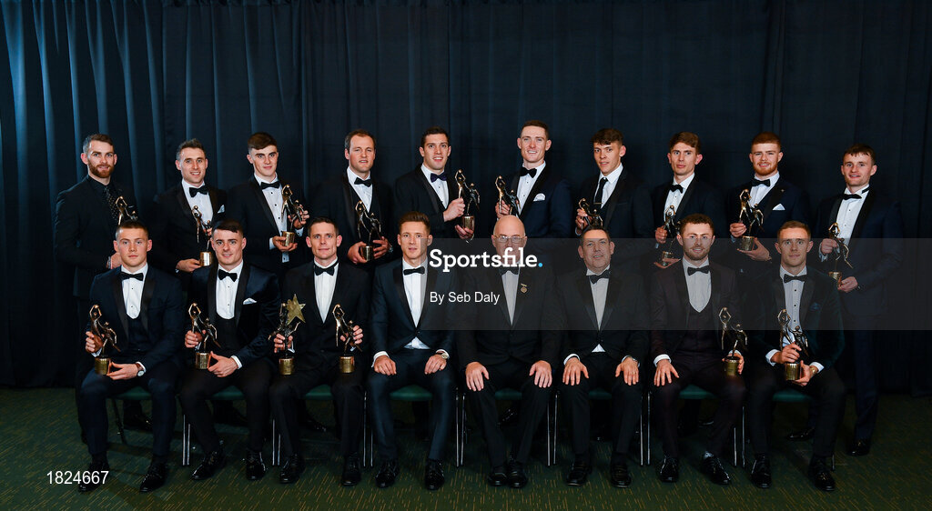 1 November 2019; PwC All-Star football team of the year, back row, from left, Ronan McNamee of Tyrone, Patrick Durcan of Mayo, Seán O'Shea of Kerry, Michael Murphy of Donegal, David Moran of Kerry, Brian Fenton of Dublin, David Clifford of Kerry, Michael Fitzsimons of Dublin, Cathal McShane of Tyrone, Tom O'Sullivan of Kerry and front row, from left, Con O'Callaghan, Brian Howard, Stephen Cluxton of Dublin, GPA CEO Paul Flynn, Uachtarán Cumann Lúthchleas Gael John Horan, PwC Senior Partner Enda McDonagh, Jack McCaffrey and Paul Mannion of Dublin during the PwC All-Stars 2019 at the Convention Centre in Dublin. Photo by Seb Daly/Sportsfile
